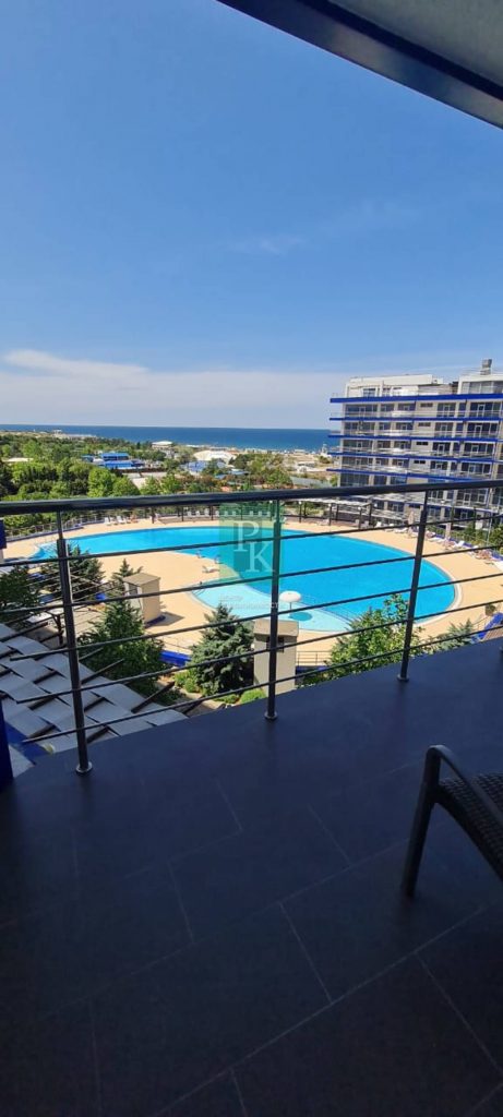 Видовые трехкомнатные апартаменты площадью 57,3 м2 в апарт-комплексе “Аква Делюкс”, с видом на бассейн на 4/ 10 этаже.