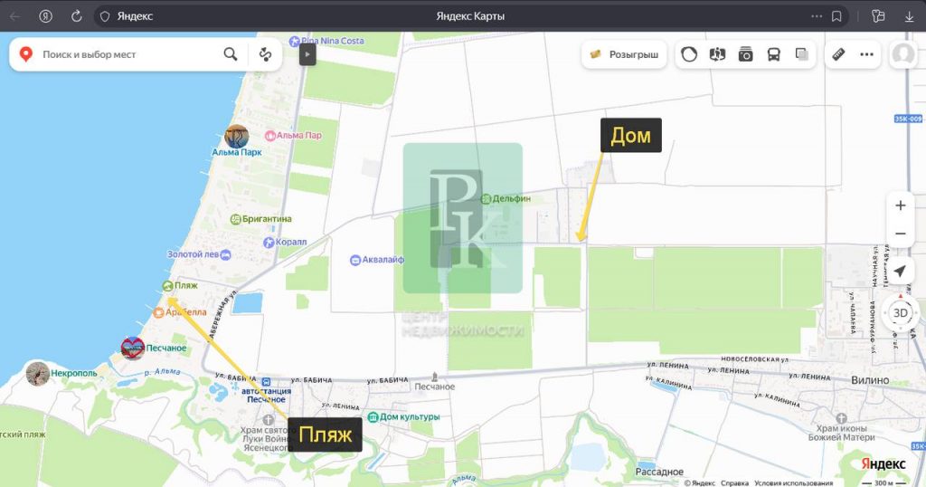 Дом находится в с. Песчаное. Вся необходимая для жизни инфраструктура рядом: продуктовые магазины, рынки, школа, аптеки, поликлиника, стоматология, почта, детский сад. До моря с песчаными пляжами 5 минут на автомобиле.