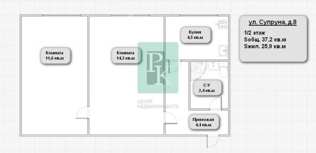 Общая площадь квартиры составляет 37,2 м². Жилая площадь – 25,9 м².