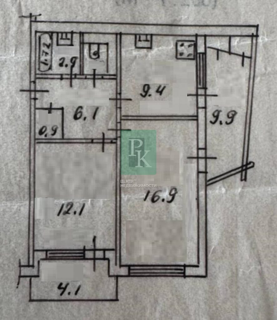 Общая площадь квартиры с учетом балкона и лоджии – 63,5 м2. Светлые комнаты – 16,9 м2 с выходом на лоджию 9,9 м2 и комната 12,1 м2 с выходом на балкон 4,1 м2, просторная квадратная кухня – 9,4 м2 с выходом на лоджию 9,9 м2, коридор – 7 м2, санузел раздельный – 2,9 м2 и 1,2 м2, высота потолков – 2,6 м.
