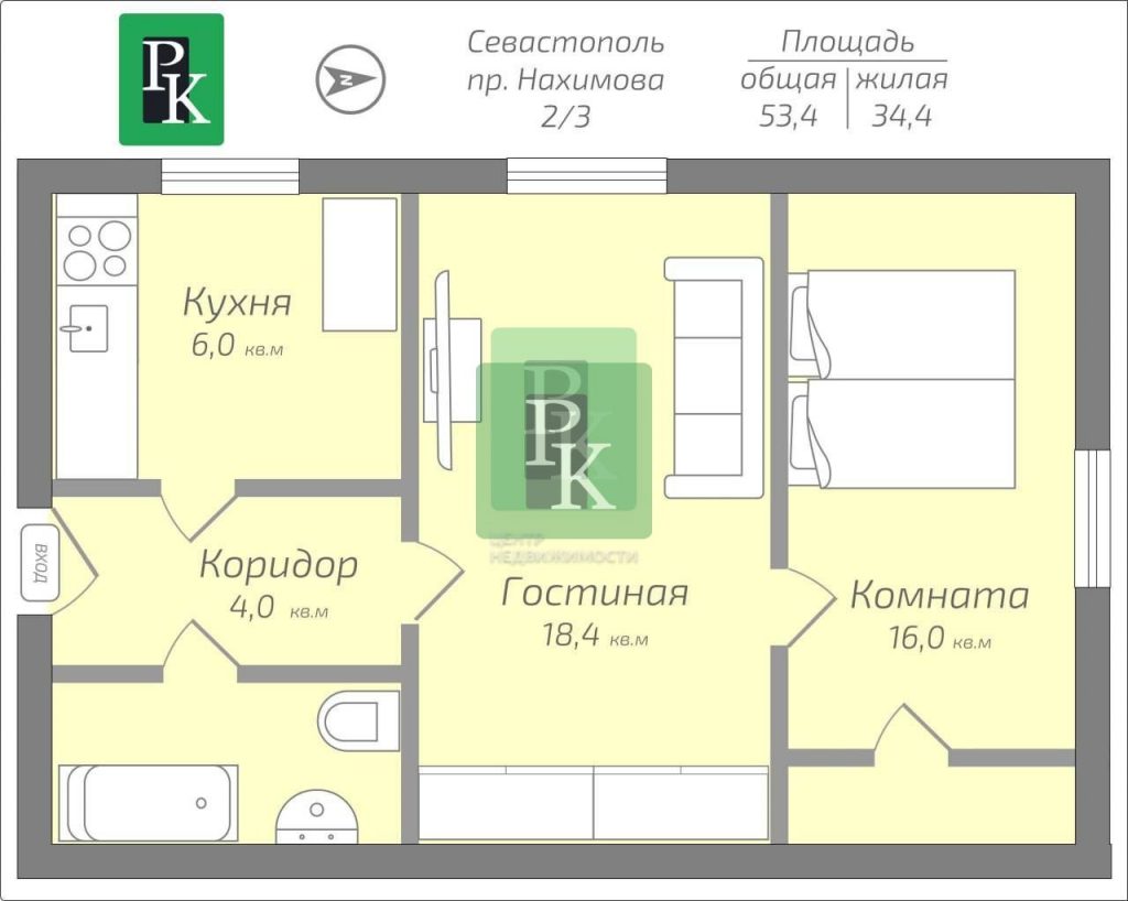 Квартира общей площадью 53.4 м² с двумя комнатами правильной формы, просторный коридор, светлая кухня, санузел совмещенный. Также имеется большая гардеробная. Теплая и светлая.