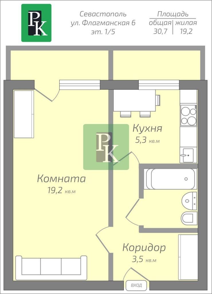 Общая площадь квартиры составляет 30,7 м2, площадь небольшой уютной кухни составляет 5,3 м2, комната правильной формы площадью 19,2 м2 позволит вам грамотно зонировать пространство, из комнаты предусмотрен выход на балкон.