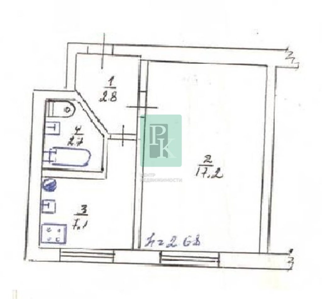 Квартира расположена на первом высоком этаже пятиэтажного дома. Общая площадь квартиры – 29,8 м2. Комната – 17,2 м2, кухня – 7,1 м2, коридор – 2,8 м2, санузел совмещенный – 2,7 м2. В квартире установлен газовый котел. Квартира с отличным ремонтом. Дом 1969 года, из инкерманского камня: толстые стены обеспечивают хорошую шумо- и теплоизоляцию, зимой они хорошо держат тепло, а летом нагреваются медленно, даже в самое жаркое лето в квартире можно жить без кондиционера.