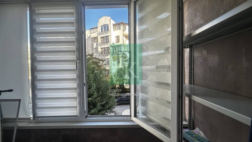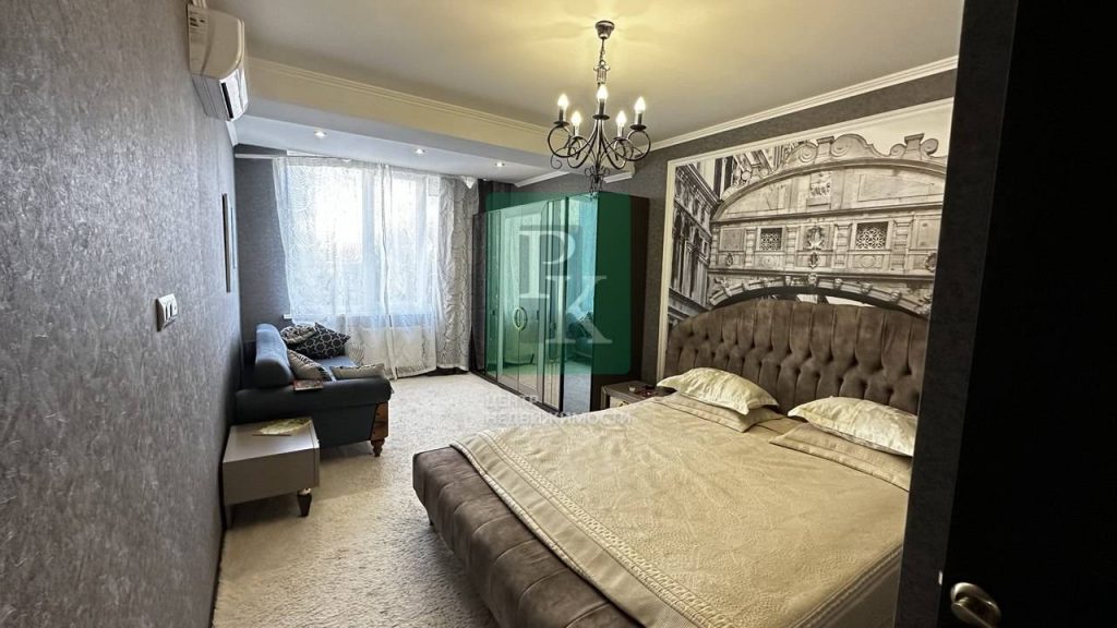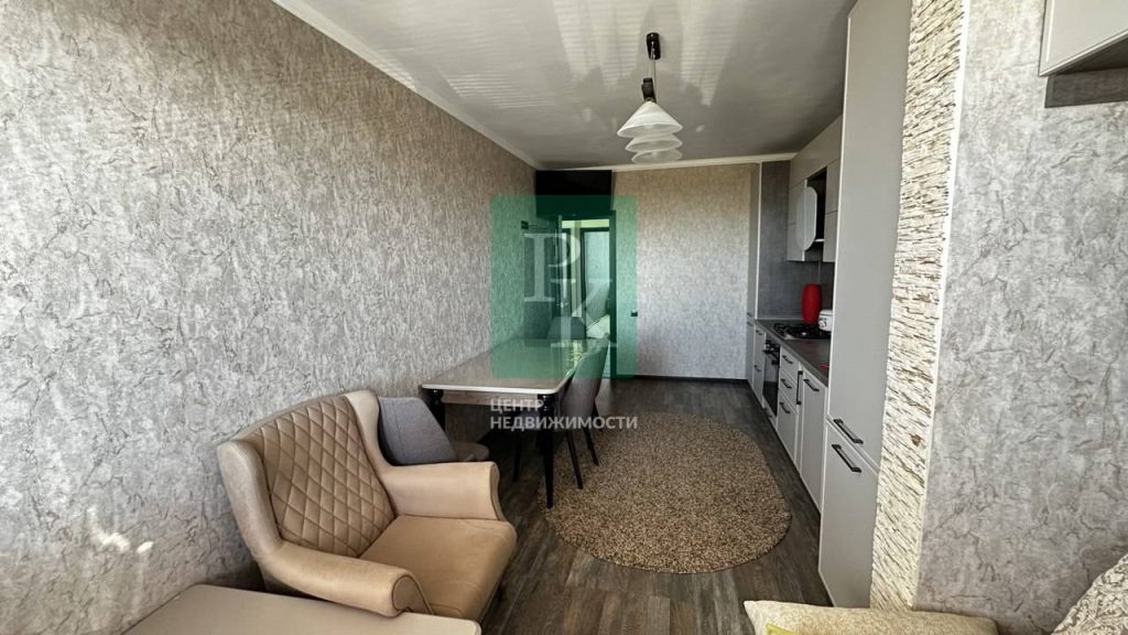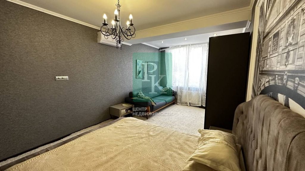 Зона отдыха – 2 интерьерных кресла и кофейный стол, а также ортопедический диван от Askona, окна с видом на Парк победы и море.