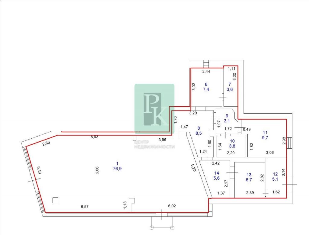 Основное помещение зальной планировки – 77 м², есть офисная часть – кабинет, подсобное помещение, свой санузел.