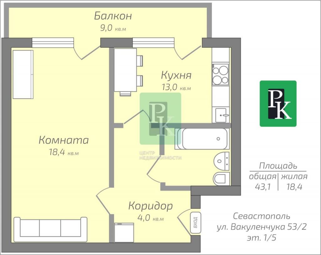 Однокомнатная квартира 43,1 м2, на ⅙ этаже дома. Объект расположен по адресу: г. Севастополь, Гагаринский район, улица Вакуленчука, д 53/2.