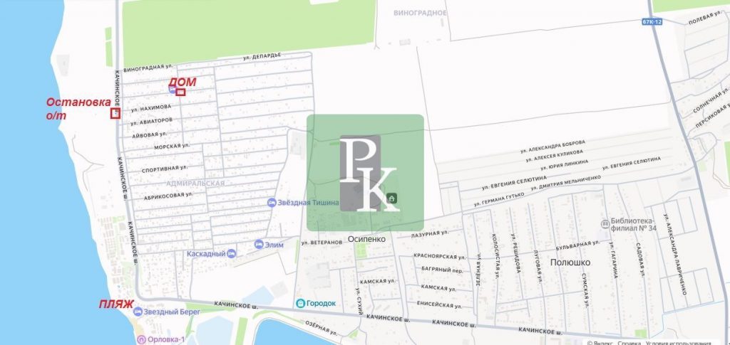 Рядом есть остановка общественного транспорта (300 м) и море с пляжами (1,5км). В соседнем поселке Кача, до которого 4 км, расположены: рынок, большие продуктовые магазины, школа, банк, МФЦ, автостанция, церковь, спорт площадки. До Севастополя – 25 км, а до пл. Захарова, откуда ходят катера до центра города – 12 км, или 20 минут на автомобиле.