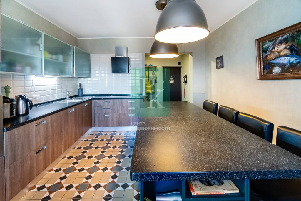 Квартира на видовом тринадцатом из шестнадцати этаже в элитном доме 2013 года постройки. Общая ее площадь с учетом лоджий составляет 108,7м2 , жилая – 37,5 м2 и очень просторная кухня – 16,5 м2. Санузел в квартире совмещенный. Высота потолка 2,8 метра, то дает еще больше простора этой и без того очень габаритной квартире. Выполнен дизайнерский ремонт с использованием дорогих строительных материалов.