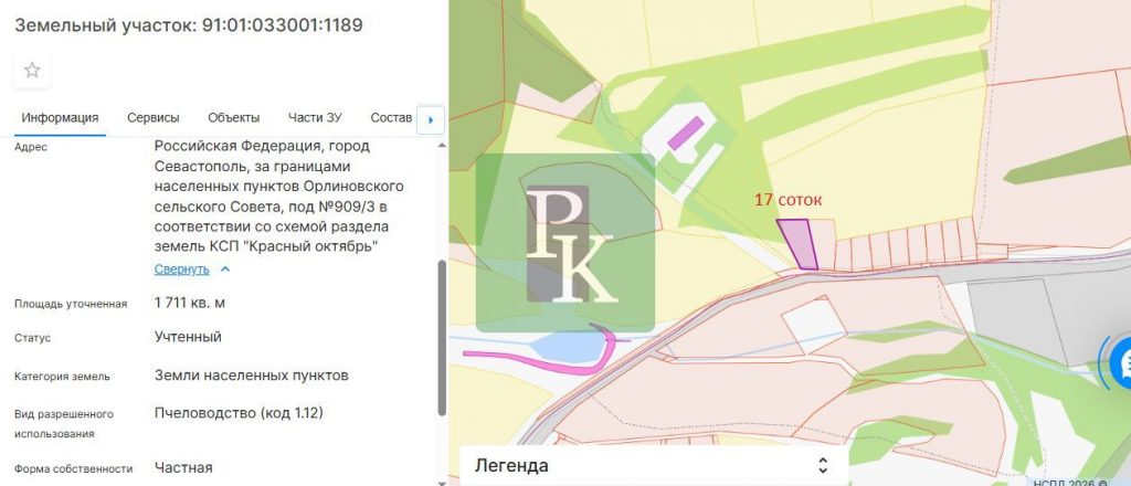 Российская Федерация, город Севастополь, за границами населенных пунктов Орлиновского сельского Совета, под №909/3 в соответствии со схемой раздела земель КСП "Красный октябрь"