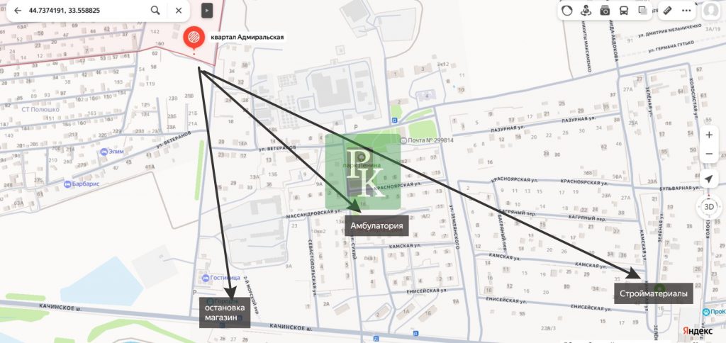 Участок находится рядом с массивом жилой застройки с удобным подъездом. Рядом с Качинским шоссе Остановки общественного транспорта в непосредственной близости. И всего в 1,5 км от оборудованного пляжа «Звездный берег».