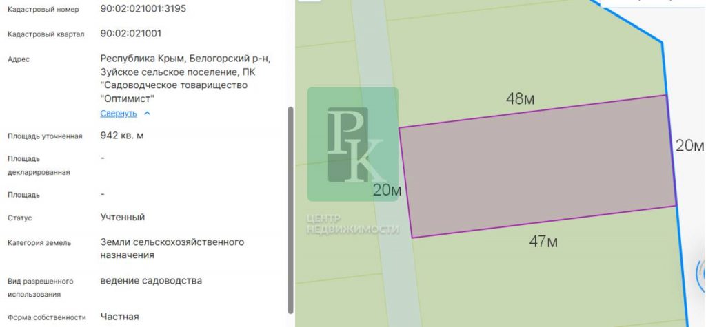 Участок 9,4 сотки расположен в Респ. Крым, Белогорский р-н, п. Зуя, ПК “Садовое товарищество ”Оптимист”. Участок ровный, с соотношением сторон 20*48*20*47 м. Подъезд по грунтовой дороге.